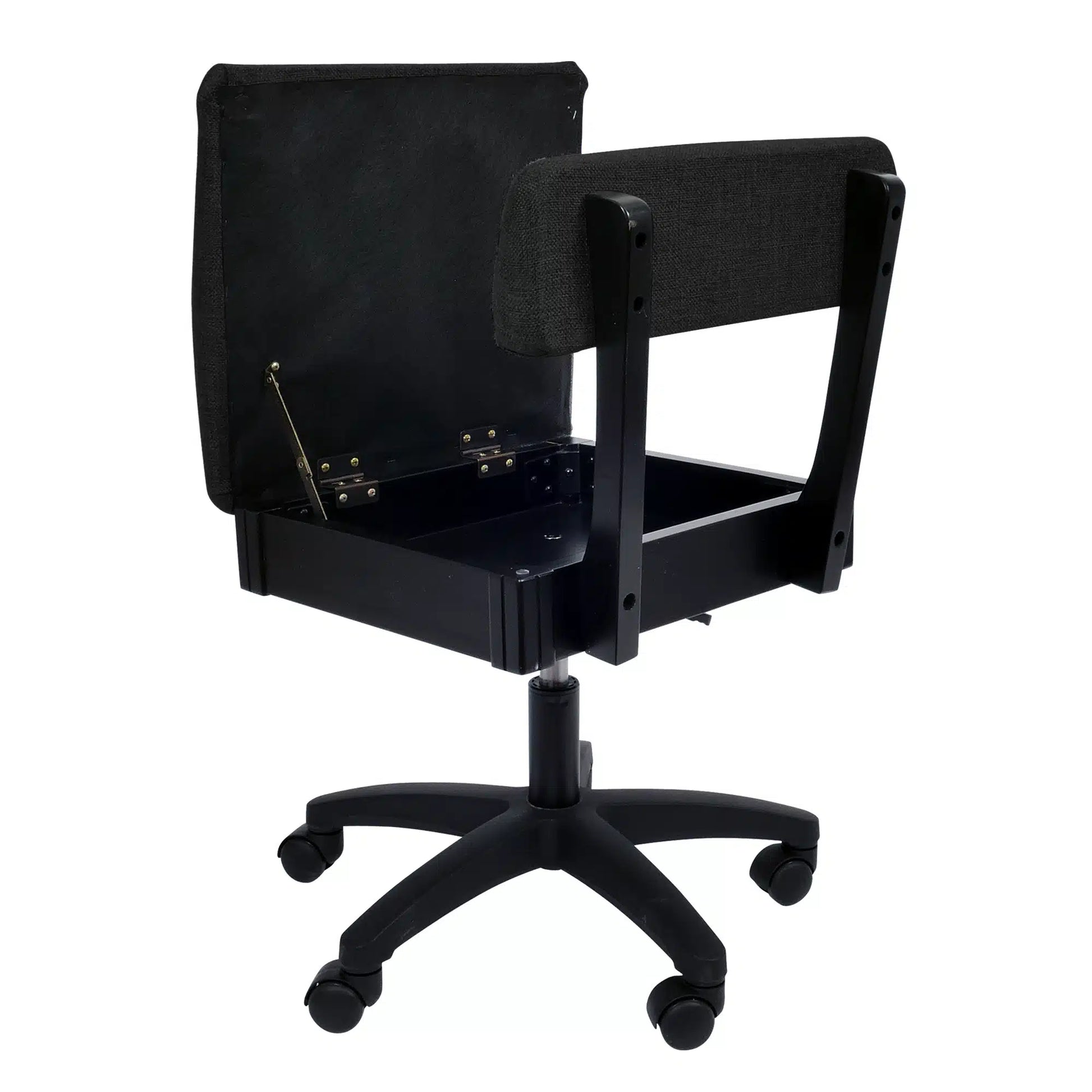 The chair’s adjustable seat (seat height moves between 18 and 22 inches), plush cushions, lumbar support and five-star 360° swivel base make it easy to sew ergonomically, and the seat’s secret storage compartment is perfect for stashing notions or an emergency chocolate bar.