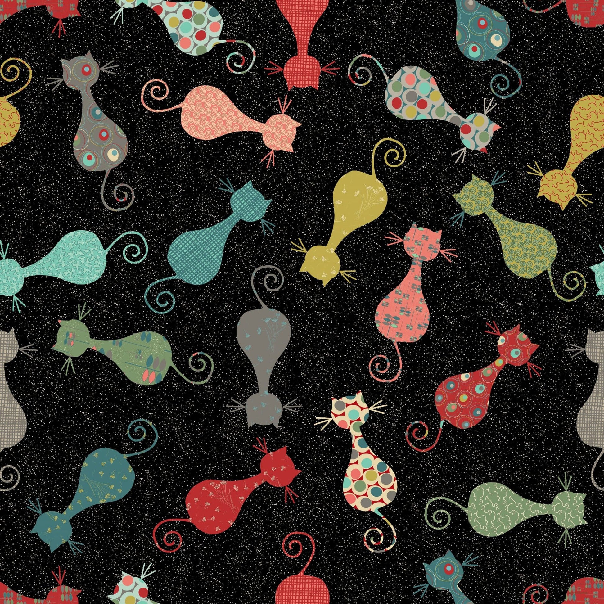 This purrrrr-fect print truly is the Cat’s Meow. The heavy-duty tweed upholstery fabric features colorfully patterned cat silhouettes scattered across a speckled black field.