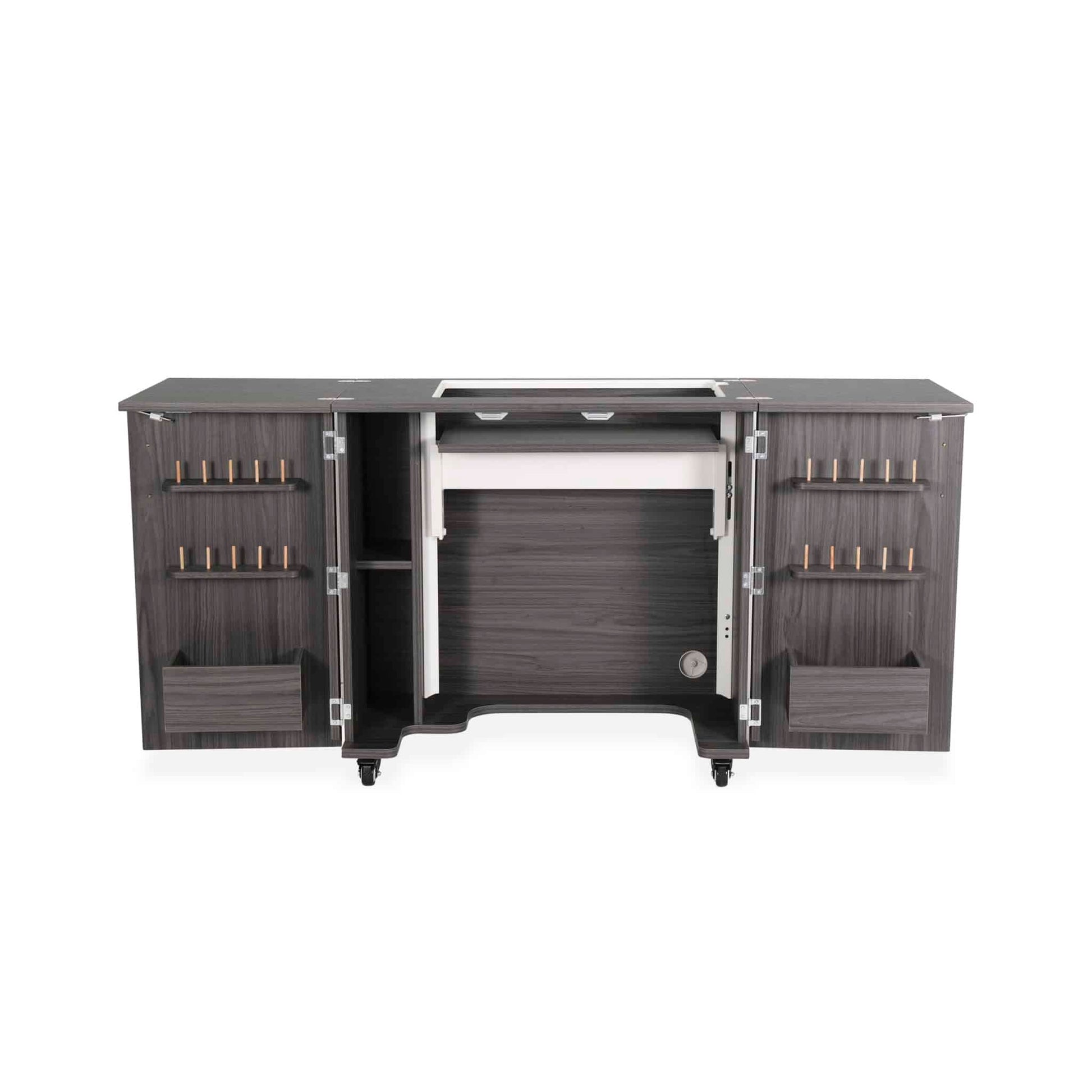 Bandicoot Sewing Cabinet is the signature mid-size sewing cabinet by Kangaroo Sewing Furniture highlighted by a 3-position hydraulic sewing lift for free arm and flat bed sewing, and its home-friendly collapsible footprint! Bandicoot features a dual shelving unit, 10 thread spool holders per door, and spacious door cubbies to store sewing notions, scissors and fabric swatches! A timeless design with signature features – let Bandicoot Sewing Cabinet recapture your sewing and crafting passion!