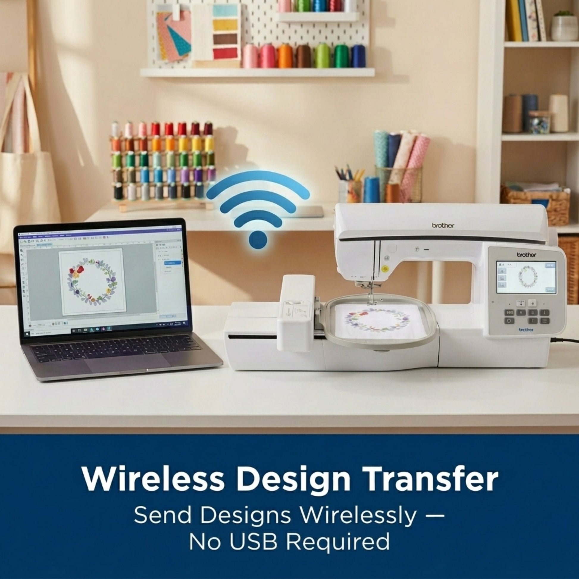 • Wireless capability The durable NQ1700E has wireless ability, so you can send designs from your PC to your machine when connected to a wireless network, using Design Database Transfer (no USB needed).