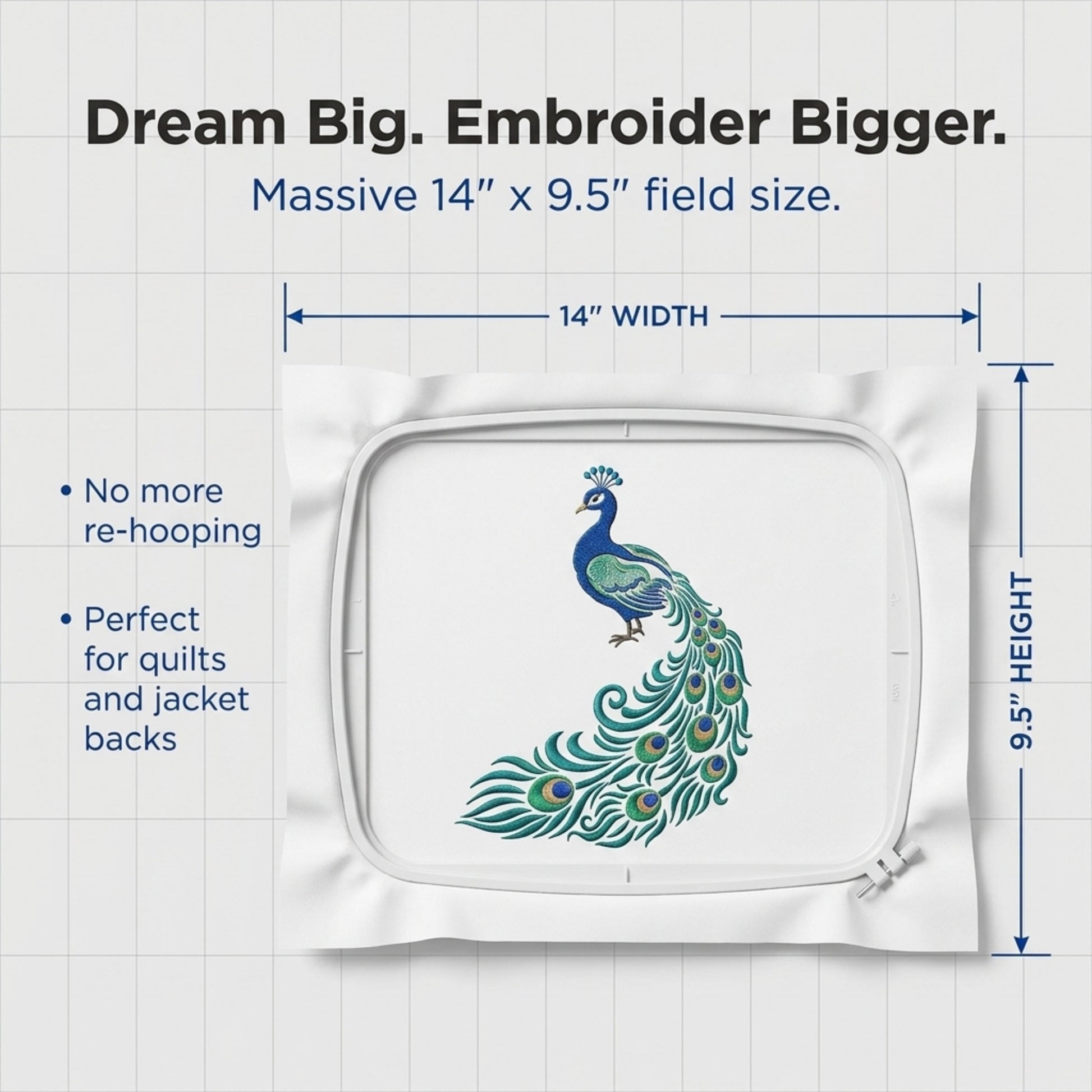 The Stellaire2 XE2 has room to create with 56 square inches of workspace and has a healthy 11.25" from the needle to arm. The large embroidery area of 9.5" x 14" can handle just about anything your imagination throws at it.