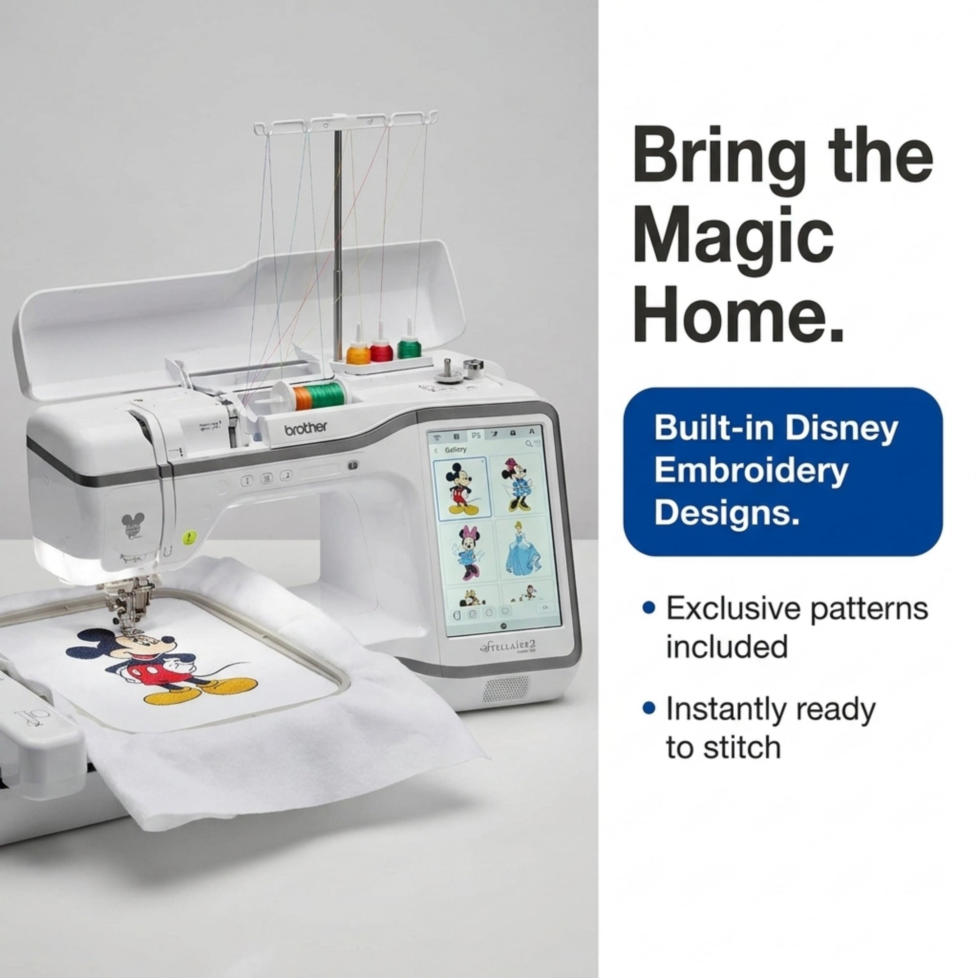 - Built-in Disney Designs- The Stellaire2 has the magic of 101 Disney embroidery designs built right in, featuring Mickey Mouse, Minnie Mouse, Goofy and Pluto. Plus, your favorite characters from Frozen, Finding Nemo and Cars! Brother customers get exclusive access to even more Disney and Disney•Pixar embroidery designs through the iBroidery.com Download Center.