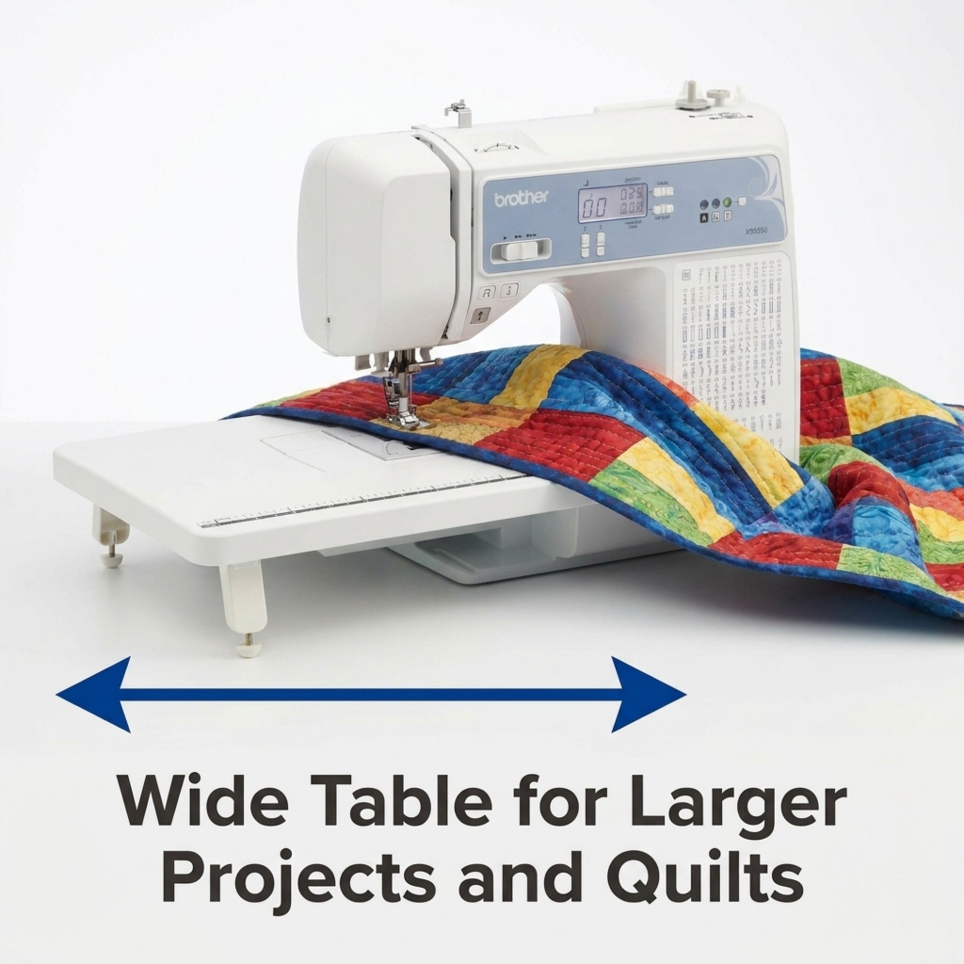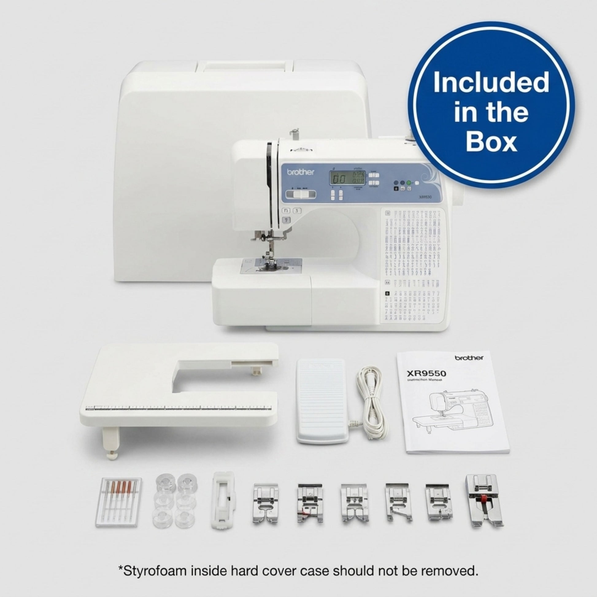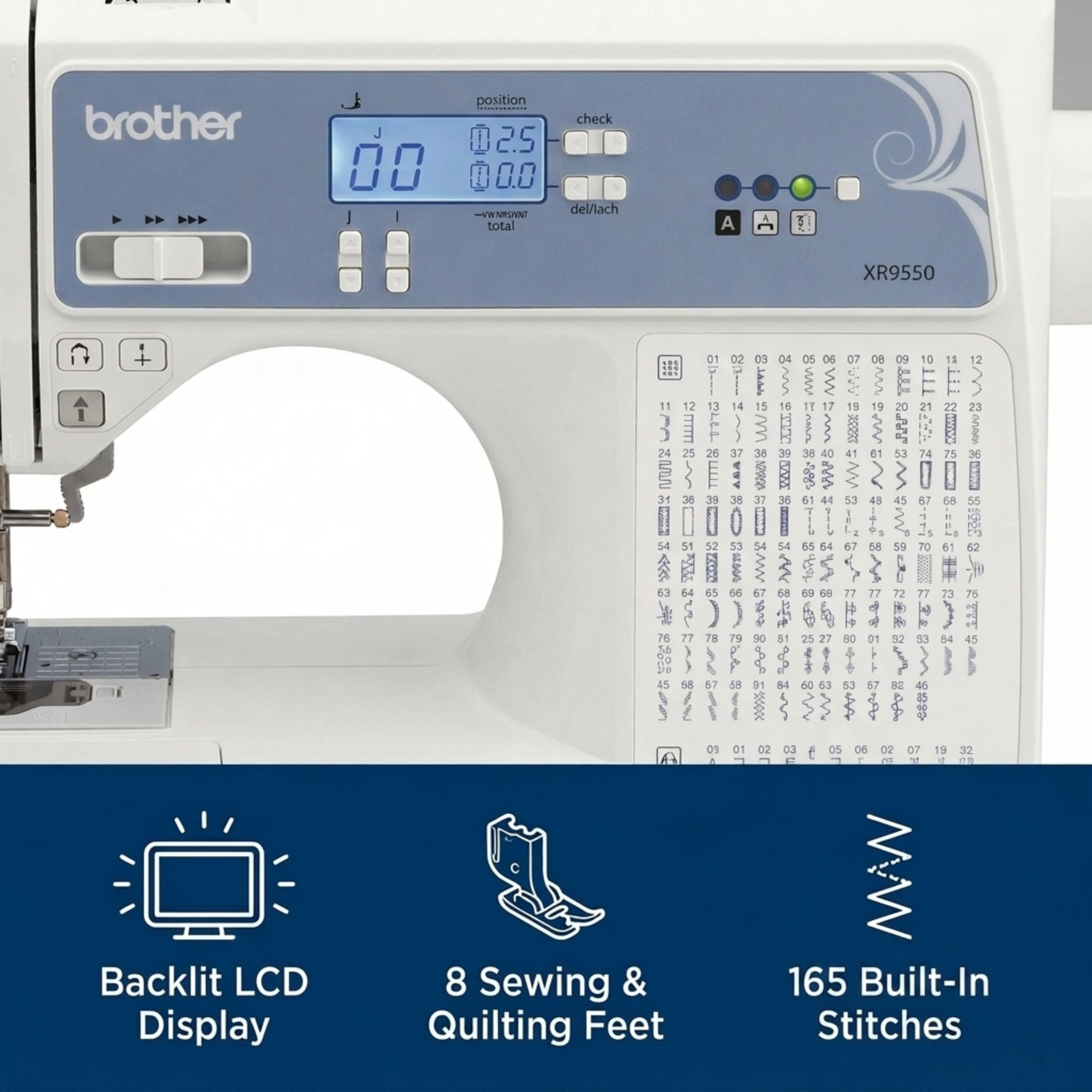 Celebrate the designer in you with the XR9550 Computerized Sewing Machine! This machine comes with 165 unique built-in utility, decorative and heirloom stitches including 8 styles of one-step auto-size buttonholes and 55 alphanumeric, making it ideal for everything from constructing garments to quilting masterpieces. The XR9550 is equipped with easy to use features like a large LCD screen which enables computerized stitch selection, free arm capability for sewing cuffs and sleeves, and drop feed for free motion quilting and sewing. The XR9550 comes packed with 8 quick change presser feet including, zigzag, buttonhole, zipper, button sewing, overcasting, blind stitch, monogramming, and quilting feet. Also included is a protective hard case and an oversized wide table to accommodate your larger quilt projects.