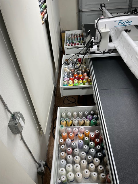Take advantage of the open space under your longarm frame by installing My Secret Drawer. Store up to 96 cones of thread or your entire ruler and template collection.