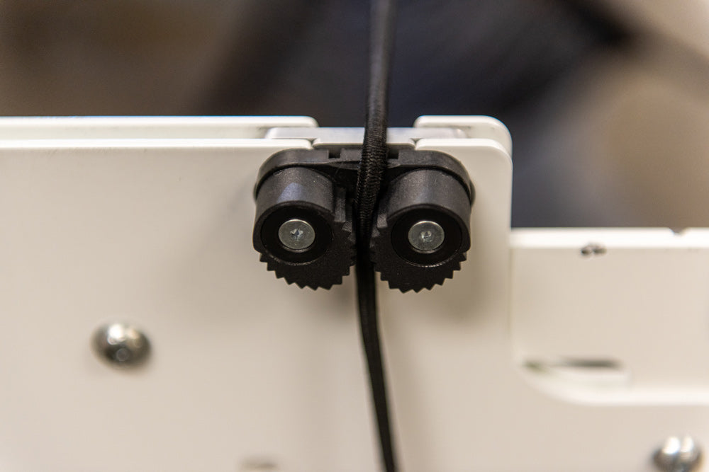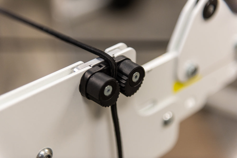 Bungee Grabbers™ are compatible with HQ Gallery 2™, HQ Studio™ 1 & 2 and HQ Fusion™ Frames. Special cam cleats lock the bungee cords in place after a quilt sandwich is secured in the side clamps. The original factory-installed bungee clamp will need to be removed from the Side Arm assembly before installing the Bungee Grabbers.
