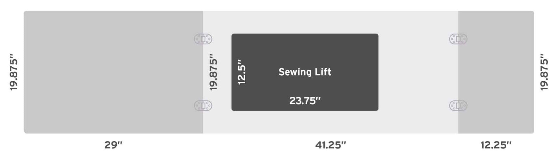 • 3-position hydraulic lift allows you to go between free arm, flat bed and storage positions • Compatible with custom acrylic sewing inserts to create a totally flush sewing surface • Large lift opening accommodates most standard sewing machines on the market, up to 55lb • 4 large drawers on cabinet’s right side to store notions and accessories • 4 interior embroidery hoop storage hooks • Large interior storage cubby • Sturdy design with heavy-duty locking casters for stability and easy mobility • Optional color-matching quilt leaf available to expand your sewing area on the rear of the cabinet • 10-year warranty, worry-free performance