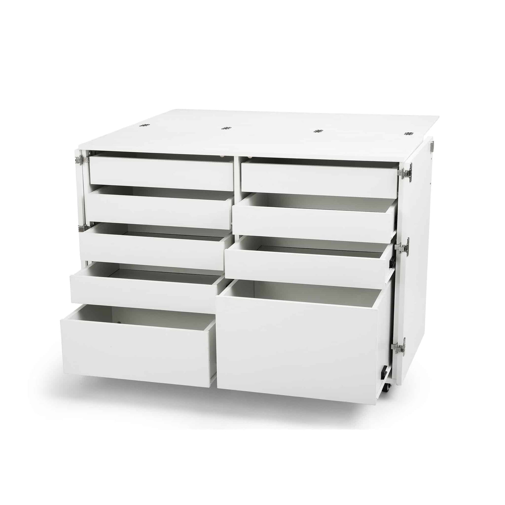 • 9 drawers of storage (1 large, 1 medium and 7 small), to store notions, crafting materials, fabric, and other sewing accessories