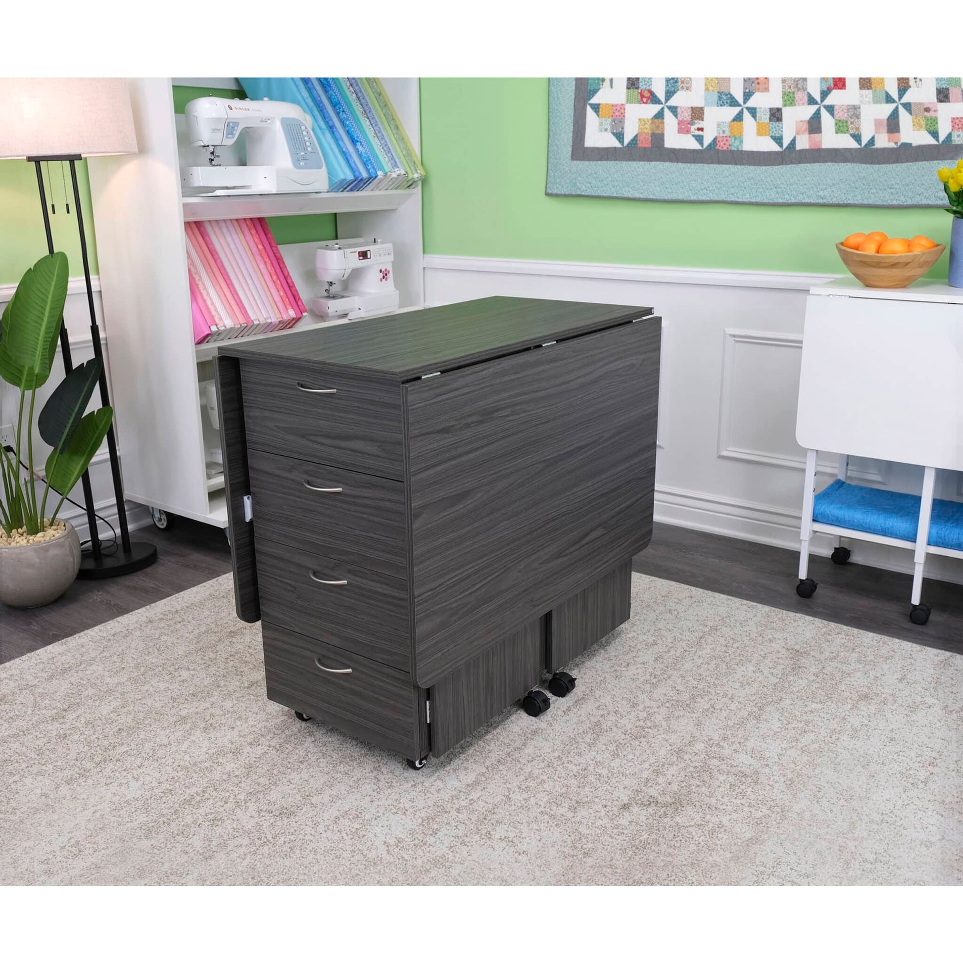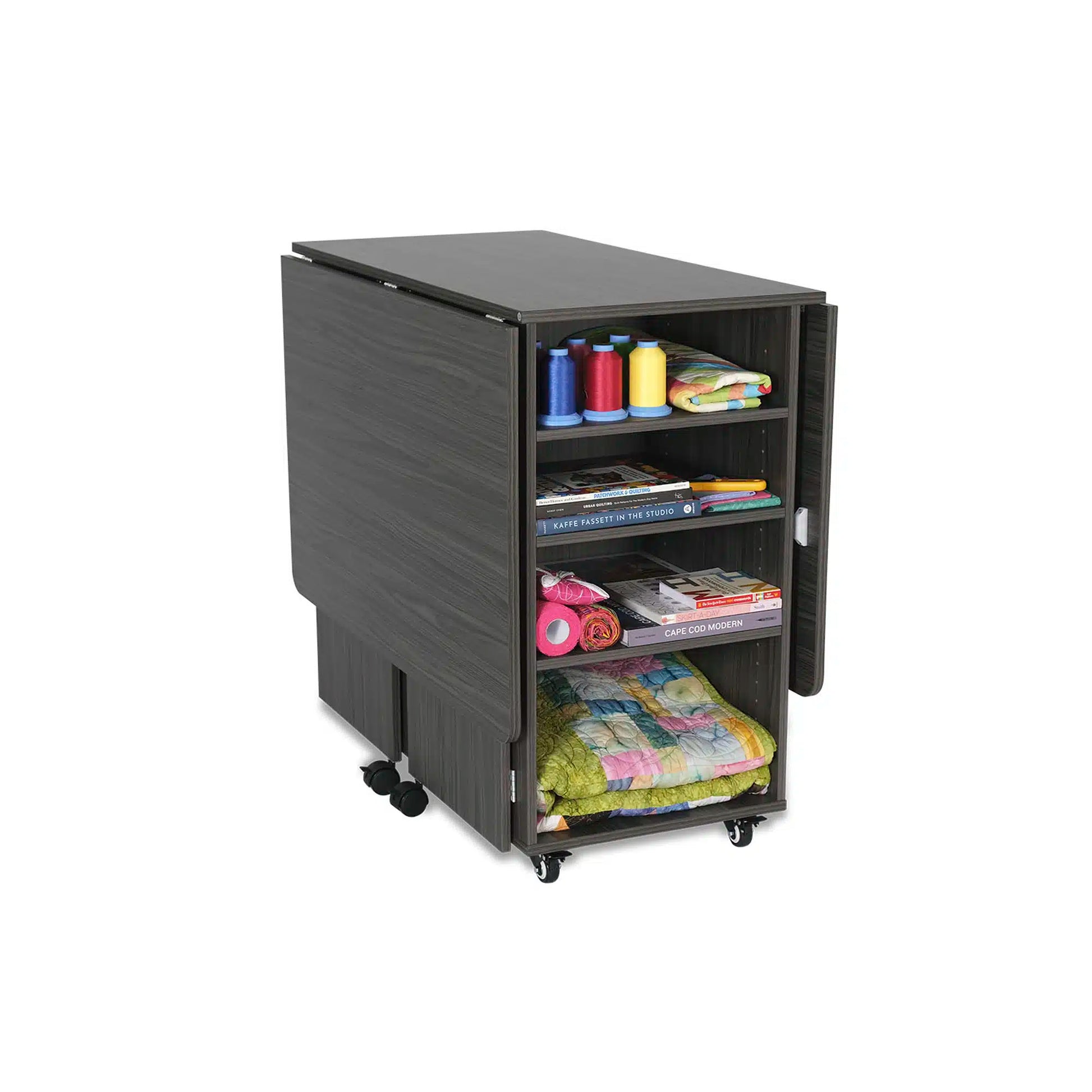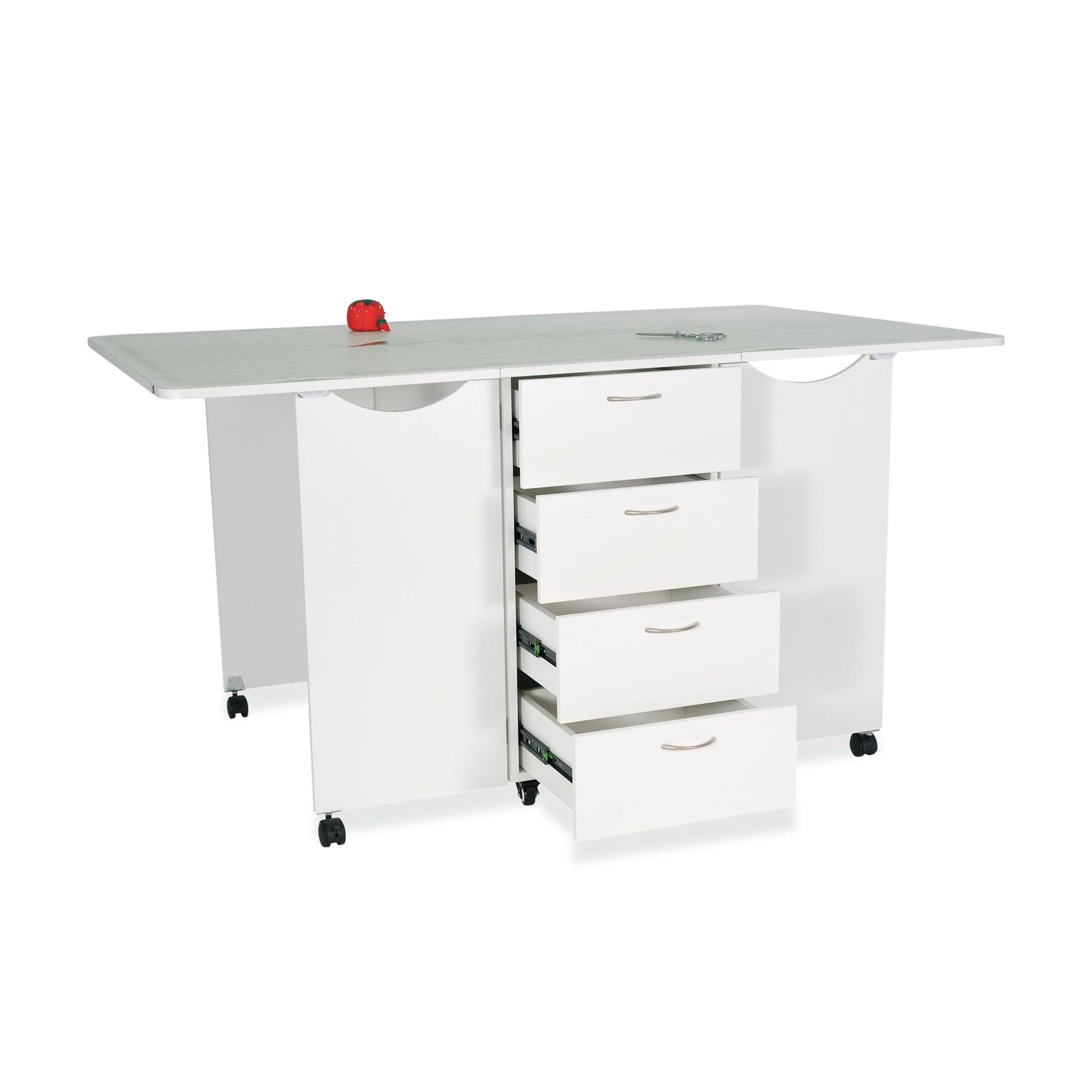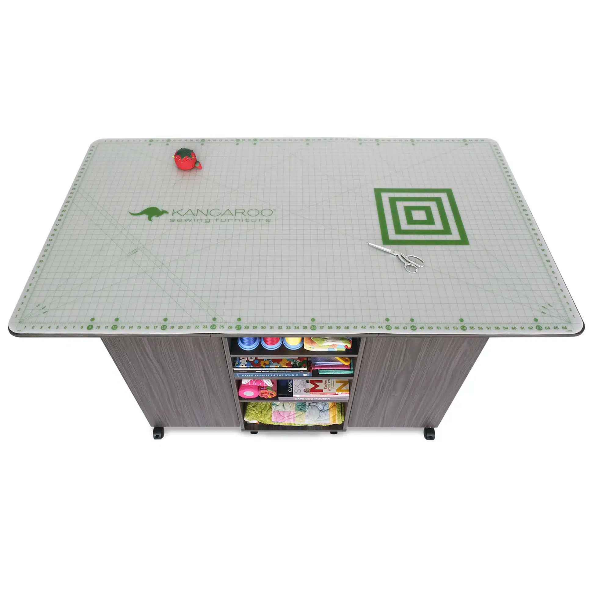 Kangaroo’s premiere cutting table is the perfect addition to your sewing and crafting studio! Kookaburra’s timeless design and elegant fixtures provide storage, convenience and function – along with an expansive 70? x 40? worksurface! Kookaburra sits on 8 heavy-duty casters to provide stability, easy mobility and 360° access. Even better – Kookaburra’s 2 side leaves fold down to 20? x 40? to easily store when not in use! 4 storage drawers on the front, 4 storage shelves on the back, and 1 beautiful cutting table to help elevate your sewing and crafting experience!