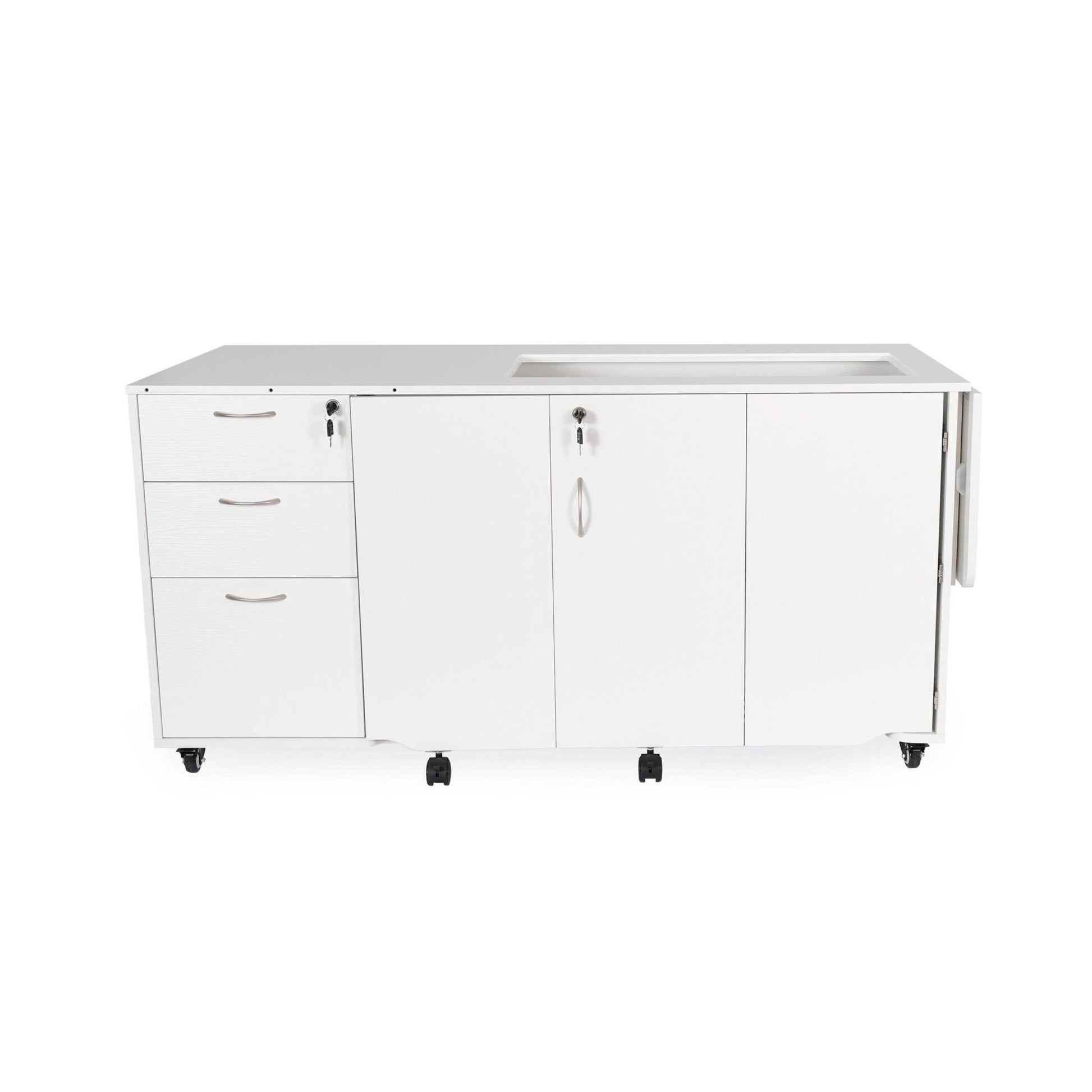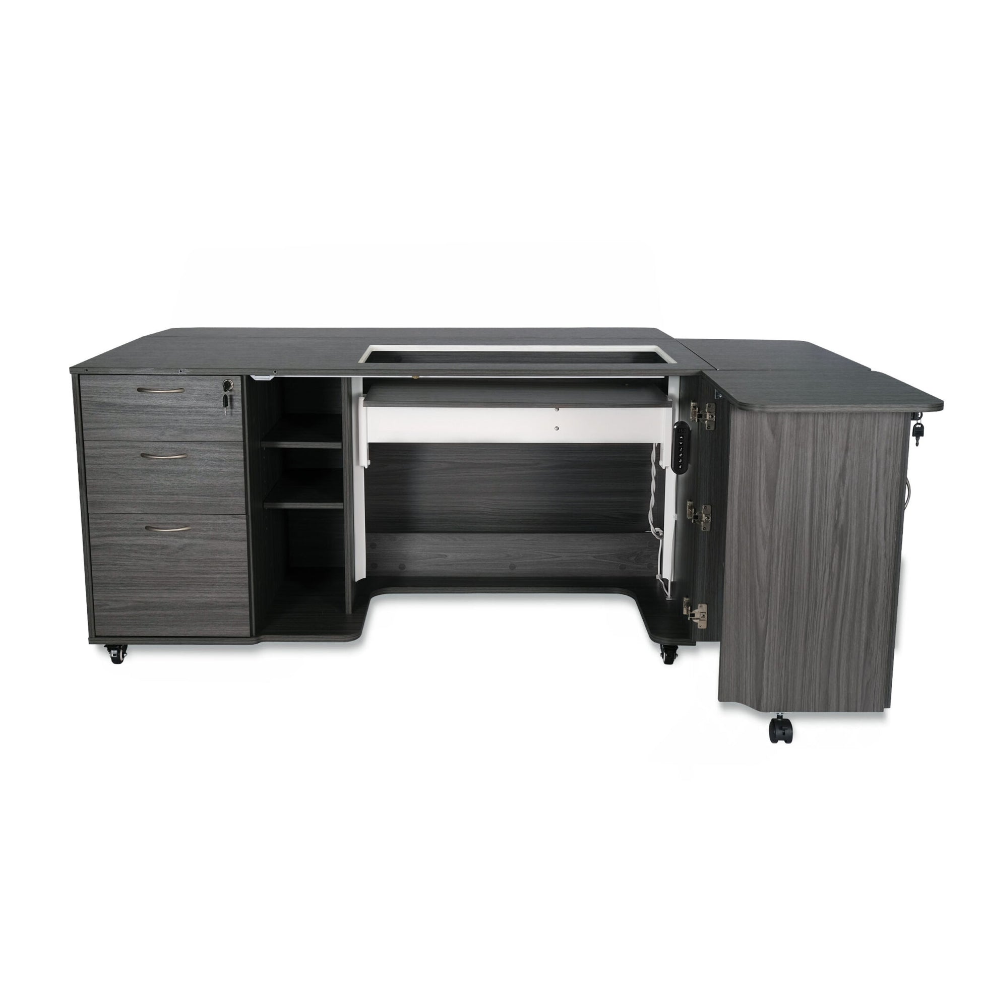 Looking for adaptability, innovative storage solutions, and miles of worksurface? Say G’day! to Sydney Electric Sewing Cabinet – our premier quilting and embroidery cabinet. With a rear quilt leaf, side leaf, tri-fold door with flip-up tabletop, pressing mat, drawer cover, embroidery spool holder, removable drawer tray insert, and innovative space for storing your embroidery arm, this cabinet can hold it all and do it all. We designed Sydney with the largest premium machines in mind – the extra-large lift opening and powerful dual rail electric lift accommodates the biggest premium machines on the market (up to 65 lbs). You can be sure that whatever project you’re working on, Sydney can handle it. Heavy duty locking casters move smoothly, locking drawers keep your tools and notions hidden safely away, and the included sewing well cover panel lets you maximize your usable work surface when your machine is tucked away inside the cabinet. This big, beautiful cabinet offers tons of work surface with both leaves and tabletop extended, and folds down to a 61 x 27-inch space when not in use.