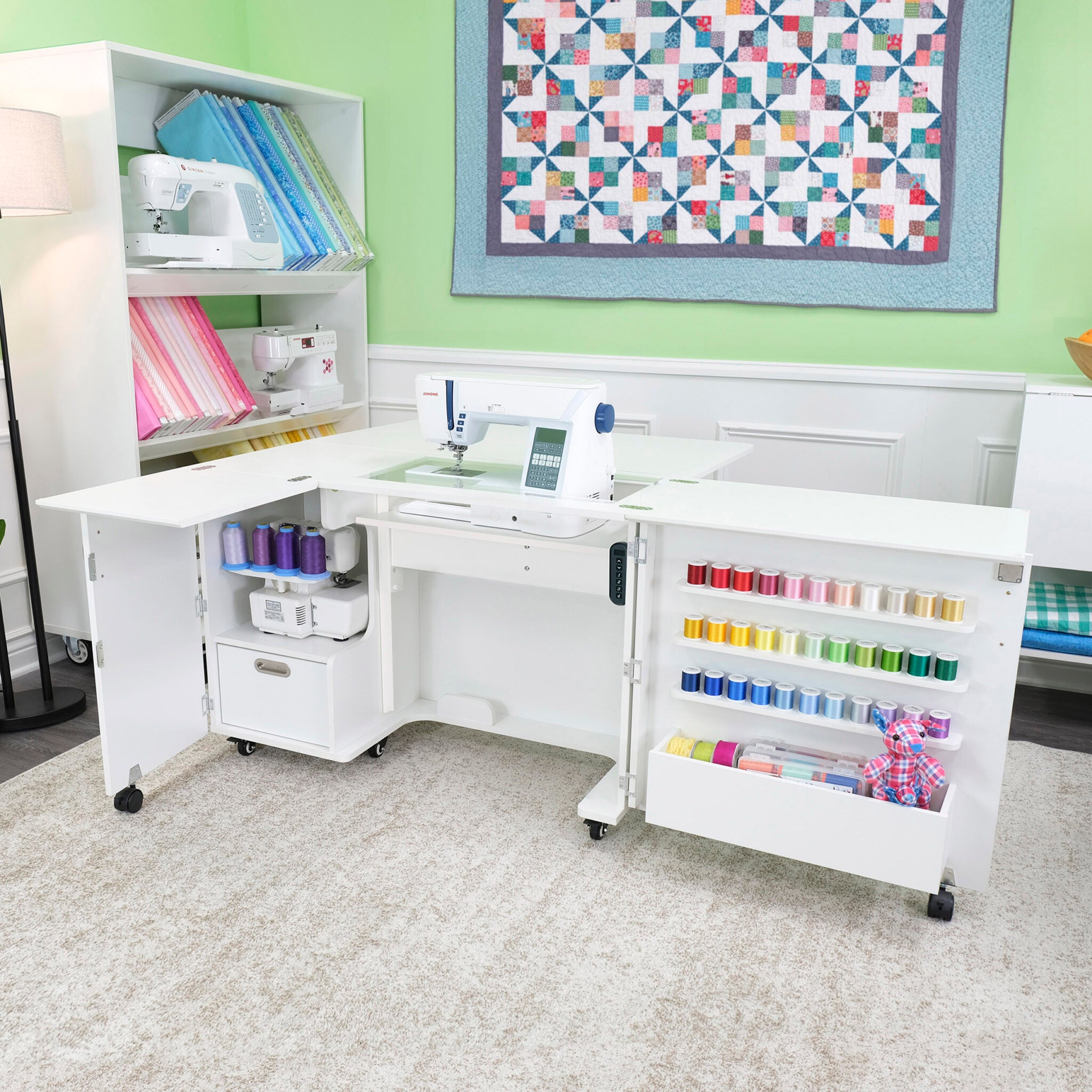 - Hideaway cubby creates storage for serger or baskets of fabric